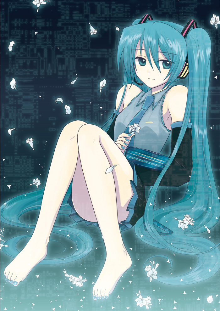 barefootblue eyesblue hairdetached sleevesfeetlong hairpetalsskirtsmilesolotwintailsvery long hair