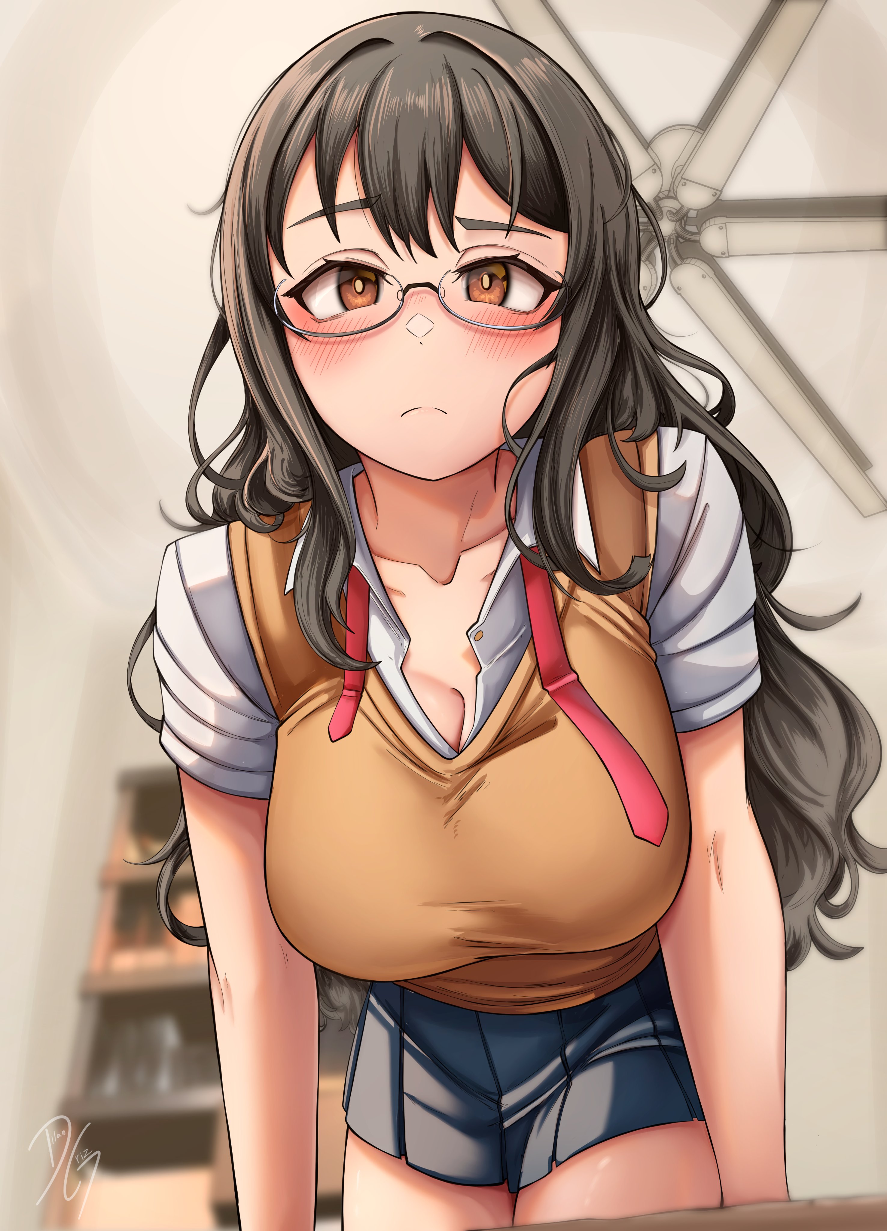1girlblushbreastsbrown hairbrown sweater vestcleavageclosed mouthcollarboneglassesgrey skirtindoorslarge breastslong hairnecktieorange eyespleated skirtschool uniformshirtskirtsolosweater vestundone necktiewhite shirt