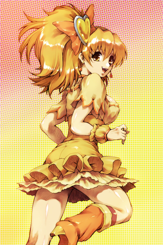 00s1girlbootsbreastsbrown eyesbrown hairfemale focushair ornamenthalftonehalftone backgroundheartheart hair ornamenthuge breastslegslong hairlooking backmagical girlsmilesolo