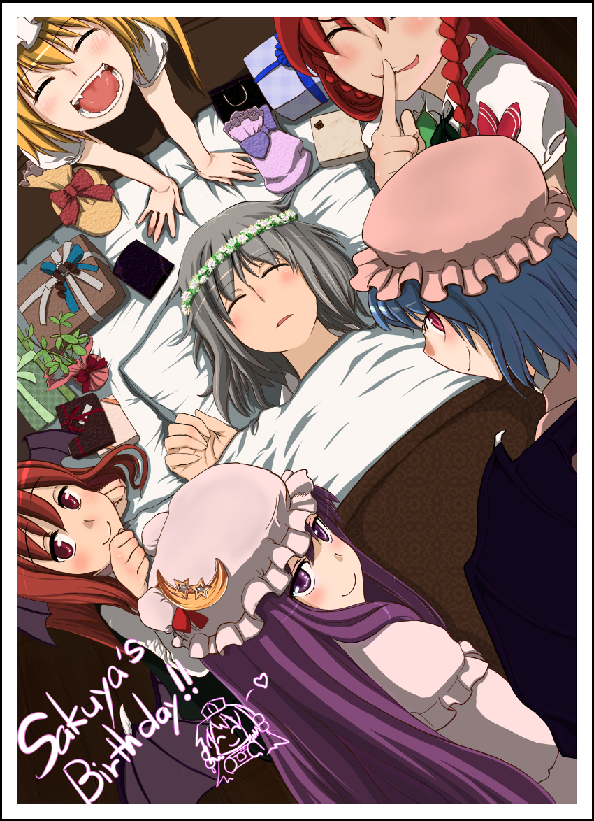 :d1boy6+girlsbat wingsbedbirthdayblushclosed eyescrescent hat ornamentfangsfemale focusfinger to mouthflowergifthappy birthdayhathat ornamentmultiple girlsopen mouthphoto (object)purple eyesred eyesribbonsleepingsmilewings