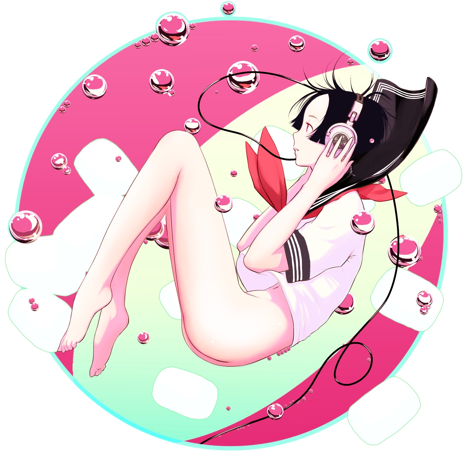 1girlbarefootblack hairbottomlessfeetfemale focusheadphoneslegsno pantiesschool uniformshort hairsolounderwater