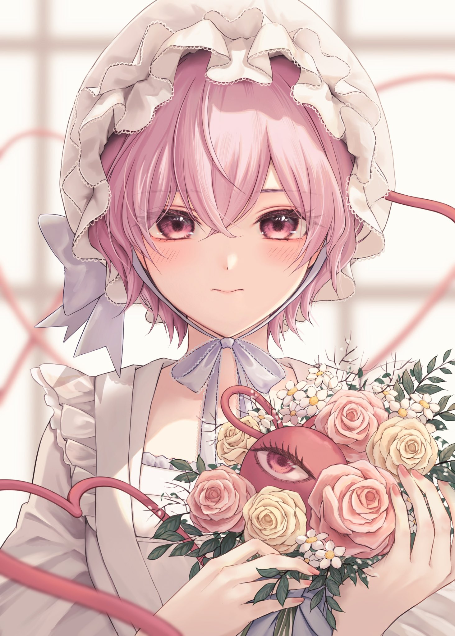 1girlblue ribbonblushbouquetclosed mouthdressflowerhair between eyeshathat ribbonholdingholding bouquetlooking at viewermob cappink flowerpink hairpink roseribbonroseshort hairsolostraight-onthird eyeupper bodywhite dresswhite flowerwhite hatyellow floweryellow rose