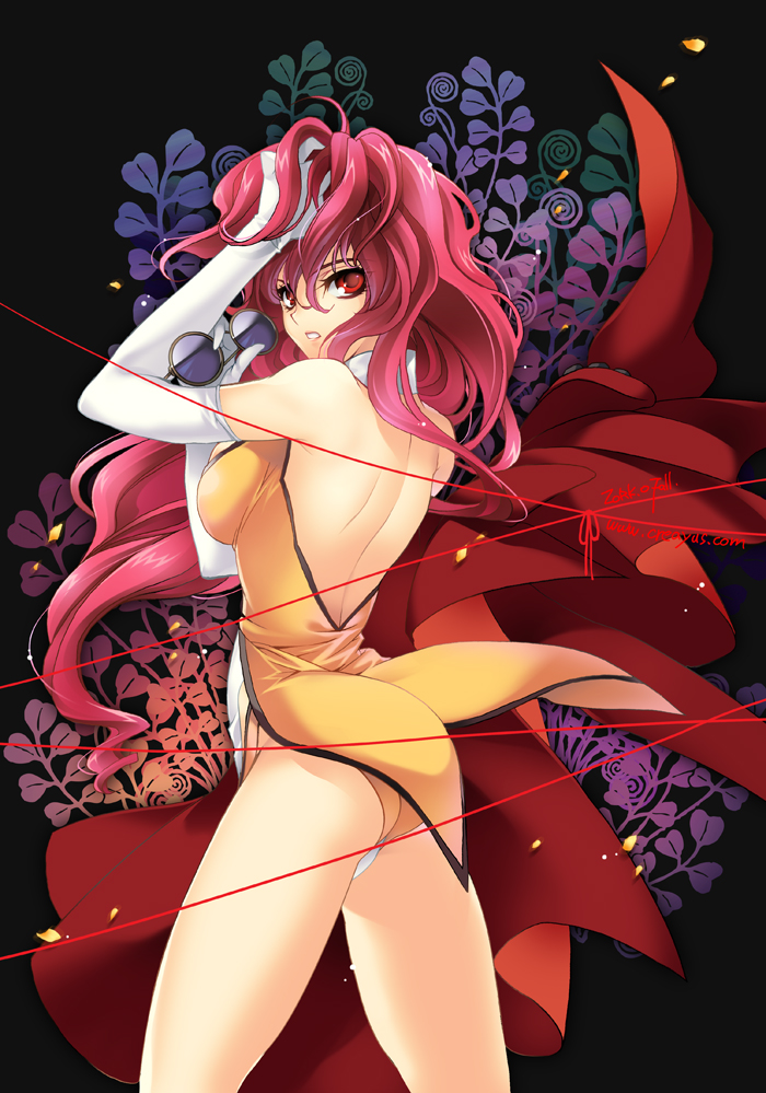1girlassbackbackless leotardbackless outfitbare backbare shouldersbreastsdominatrixelbow glovesfemale focusglovesleotardred eyesred hairsolosunglassesthighs