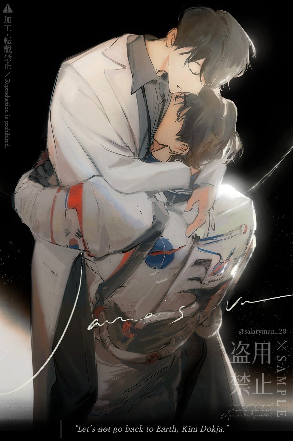 2boysarm around backarm around neckblack hairblack shirtclosed eyescoatcollared shirtcursivehuglifting personlogomale focusmultiple boysnasa logoshirtshort hairspacesuitupper bodywhite coatyaoi