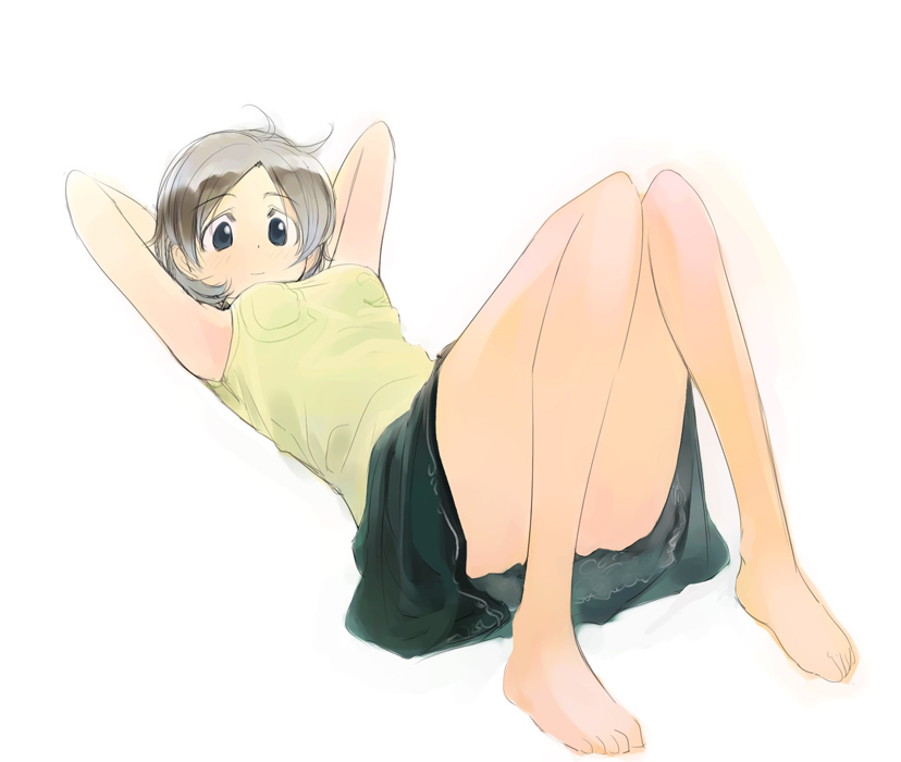 1girlarmpitsbarefootbreastsexercisingfeetfemale focusshirtshort hairsit-upskirtsleevelesssleeveless shirtsmall breastssolo