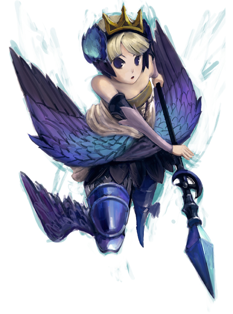 1girlarmorarmored dressbare shouldersblue eyesbootscrowndresselbow glovesfemale focusfull bodyglovesmulticolored wingspolearmpterugessolospearstraplessstrapless dressthigh bootsthighhighsvalkyrieweaponwhite backgroundwhite hairwings