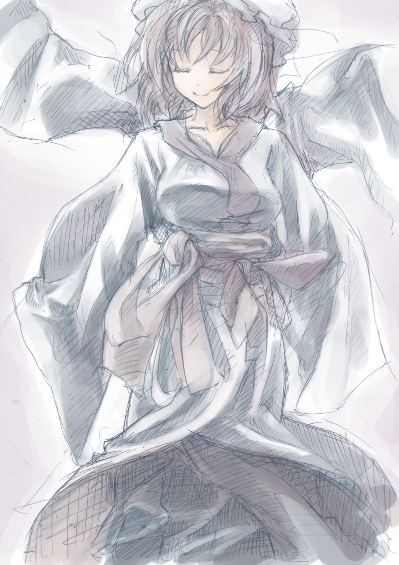 1girlbreastsclosed eyesdressfemale focusgradient backgroundhatjapanese clothessketchsmilesolowhite background