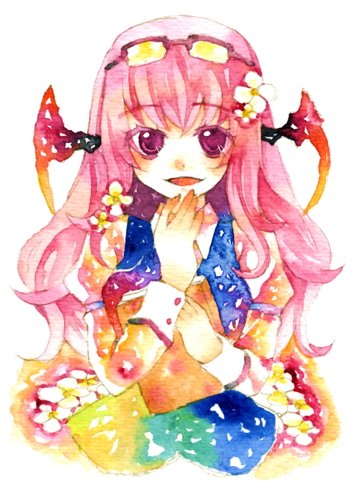 inuinui, nagae iku, saturday night fever, scarlet weather rhapsody, touhou, 1girl, chibi, female focus, hand on own hip, hat, purple hair, ribbon, short hair, smile, solo