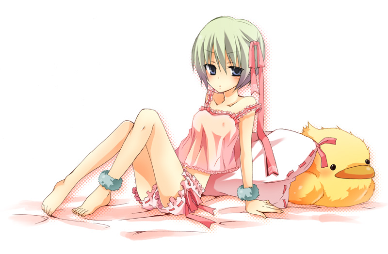 1girlarm supportbarefootblue eyescamisolefeetfemale focusflat chestgreen hairnipplessee-through clothessittingsolo
