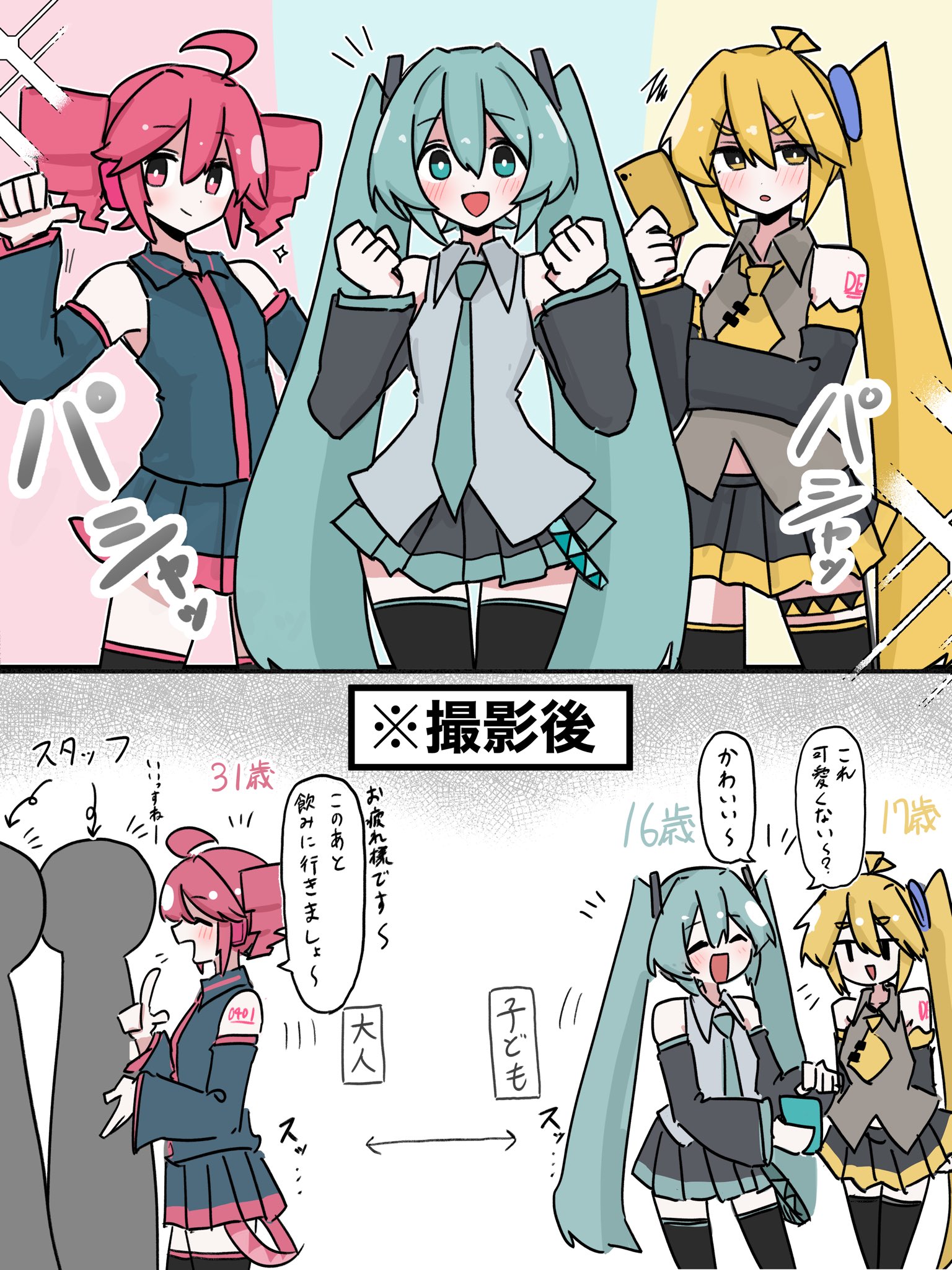 3girlsage differenceahogeblonde hairblue eyescellphonecharacter ageclosed eyesdetached sleevesdrill hairholdingholding phoneindex finger raisedlong hairlong sleeveslooking at viewermultiple girlsnecktieopen mouthphonepink hairpleated skirtprofileshirtside ponytailskirtsleevelesssleeveless shirtsmartphonesmilethigh strapthighhighstwin drillstwintailsvery long hairvocaloid boxart poseyellow eyes