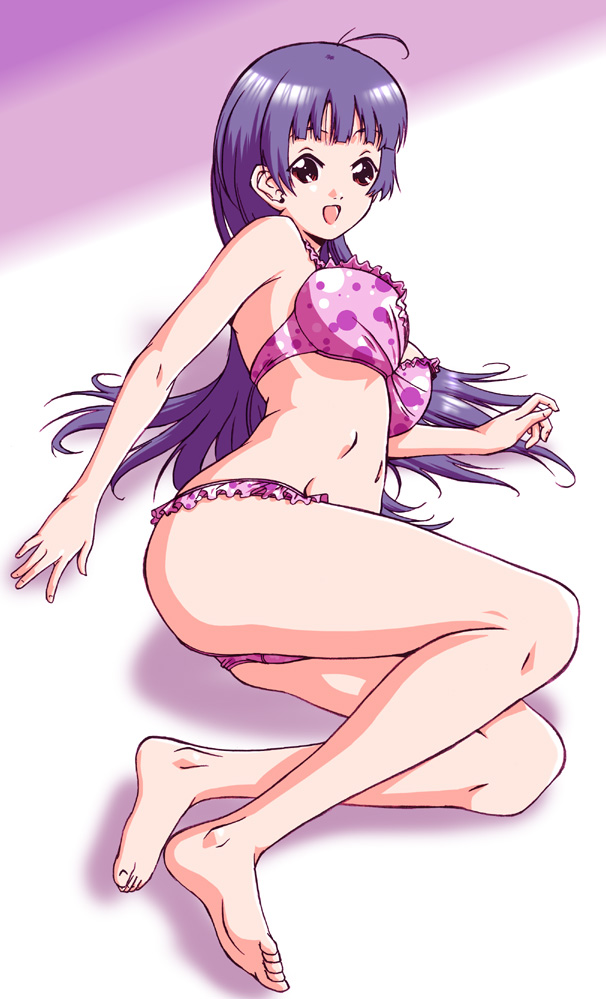 1girlahogebad anatomybarefootbikinibreastsbrown eyesfeetfemale focuslarge breastslong hairlyingmidriffpurple hairsoloswimsuit