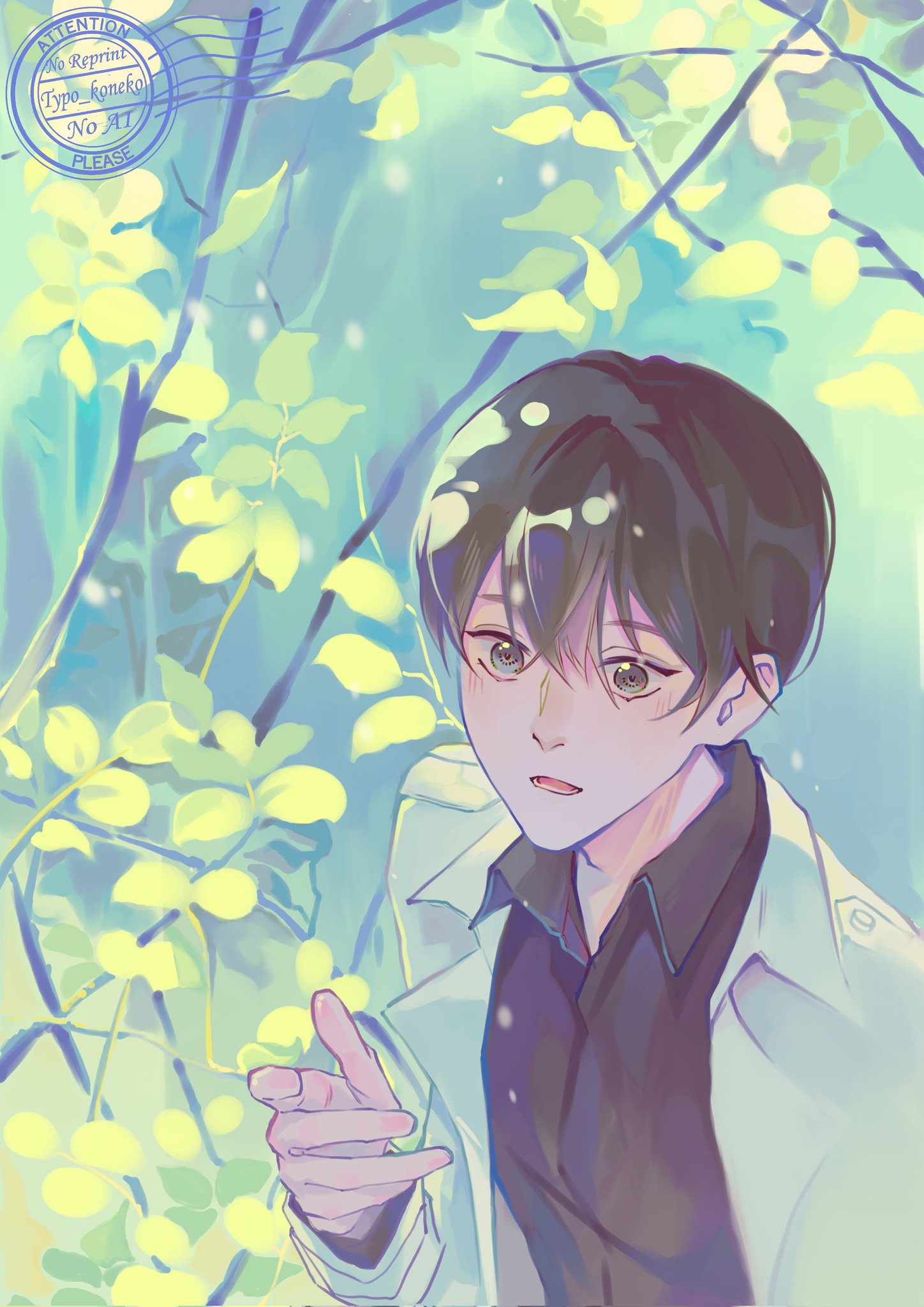 :o1boyblack eyesblack hairblack shirtbranchcoatcollared shirtdouble-parted bangshair between eyesleafmale focusopen clothesopen coatoutdoorsoutstretched handpopped collarshirtshort hairsolosparkling eyestreeupper bodywhite coatwide-eyed
