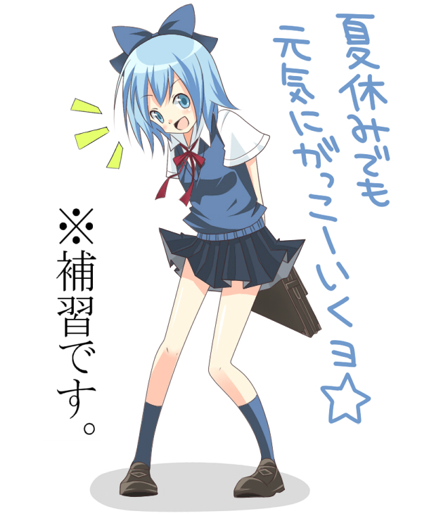 1girladapted costumearms behind backblue eyesblue hairfemale focushair ribbonmatching hair/eyesno wingsribbonschool uniformskirtsolosweater vestvest