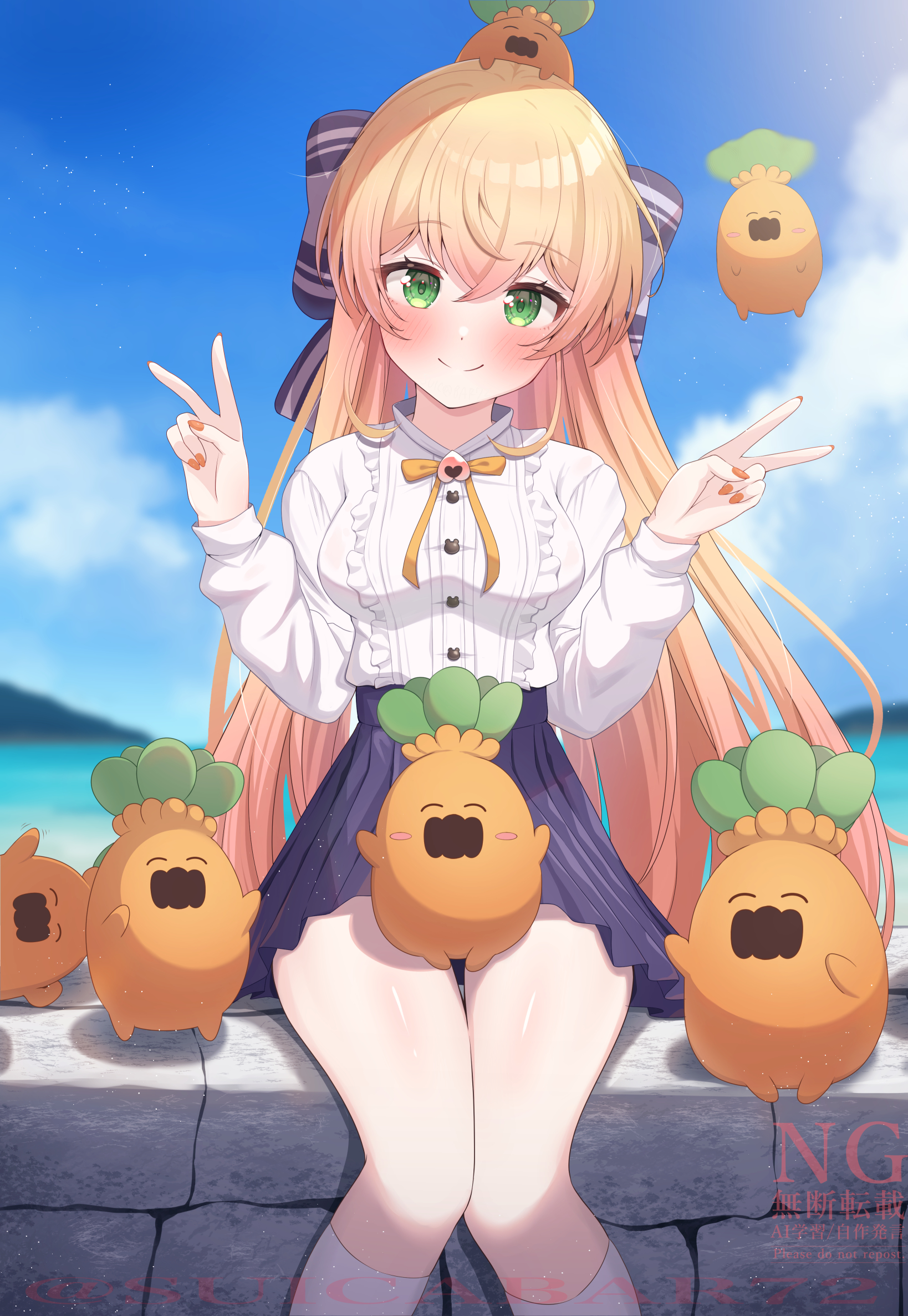 1girlalternate costumealternate hairstylebellblack bowblack skirtblonde hairblue skyblushbowbowtiebreastscenter frillsclosed mouthcrossed bangsdaydouble vflyingfrilled shirtfrillsgradient hairgreen eyeshair between eyeshair bowjingle belllong hairlong sleeveslooking at viewermedium breastsmulticolored hairnail polishneck bellon laporange boworange bowtieorange nailsoutdoorspeach ornamentpink hairpleated skirtshirtshirt tucked insidelockssittingskirtskysmilesocksthighhighstwitter usernamevvirtual youtuberwatermarkwhite shirtwhite sockswhite thighhighs