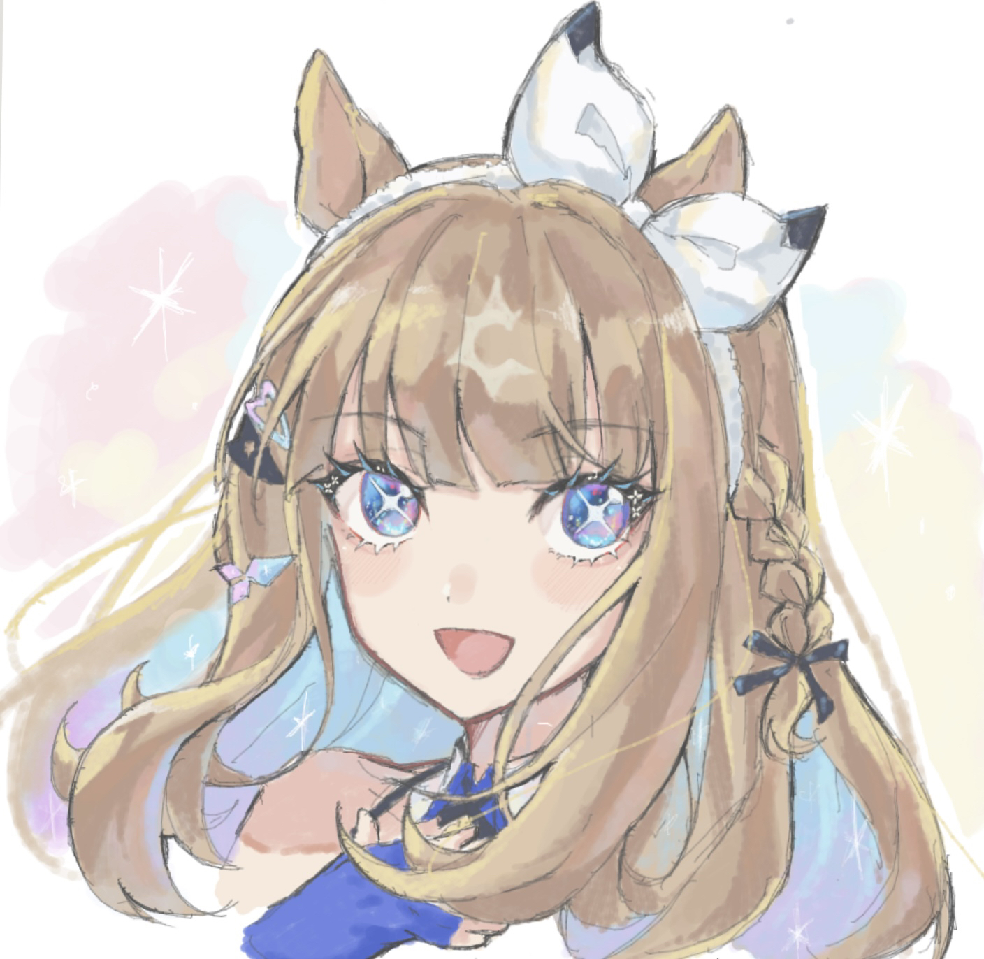 1girlanimal earsblack ribbonblue eyesblue hairblunt bangsblushbowbraidbrown haircolored inner hairgrey hairhair ornamenthair ribbonhairbandhaircliphand on own chesthorse earshorse girllong hairmulticolored hairopen mouthribbonside braidsmilesolostar (symbol)star-shaped pupilssymbol-shaped pupilswhite bowwhite hairband