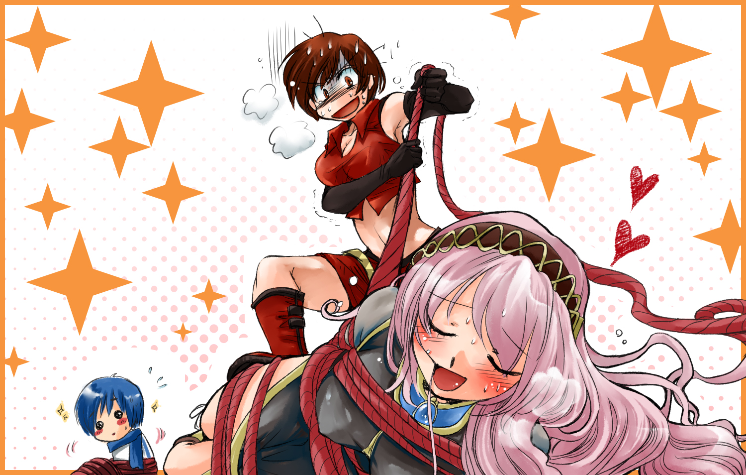 1boy2girlsangrybdsmblue hairblue scarfblushbondageboundbreast bondagebreastsbrown eyesbrown hairdetached sleeveslarge breastslong hairmidriffmultiple girlsnavelpink hairribbonropescarfshort hairskirtthighhighsvery long hairyou gonna get rapedyuri