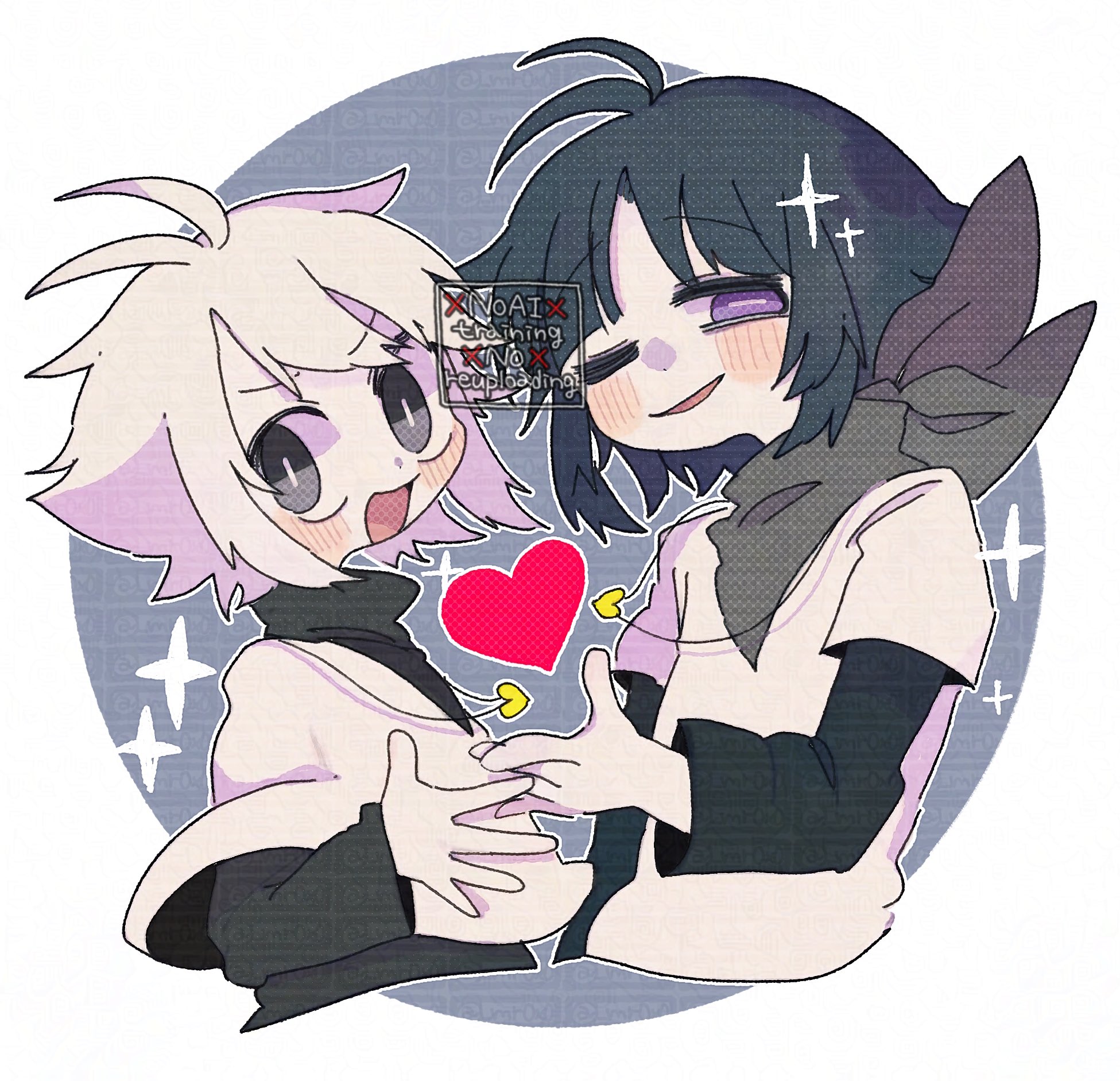 :d2boysalternate universeantenna hairbandanabandana around neckblack eyesblack hairblack shirtblushborderbright pupilsbrotherscolored skincropped torsodot nosedouble-parted bangsfilm grainflipped hairgold necklacegrey backgroundgrey bandanahair between eyeshalftonehalftone backgroundhand upheartheart necklacehorizontal pupilsjewelrylayered sleeveslong sleeveslooking at viewermale focusmultiple boysnecklaceone eye closedopen mouthoutlineoutside borderpurple eyesround bordershirtshort hairshort over long sleevesshort sleevessiblingssidelockssimple backgroundslit pupilssmilesparkletoo many watermarkstwitter usernamev-shaped eyebrowswatermarkwhite borderwhite hairwhite outlinewhite pupilswhite shirtwhite skin