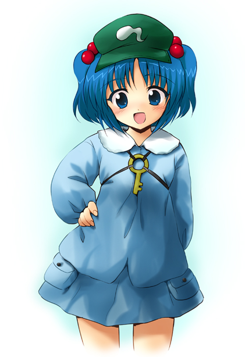 1girlblue eyesblue hairfemale focushair bobbleshair ornamenthand on own hiphathip focusmatching hair/eyesopen mouthsmilesolotwo side up