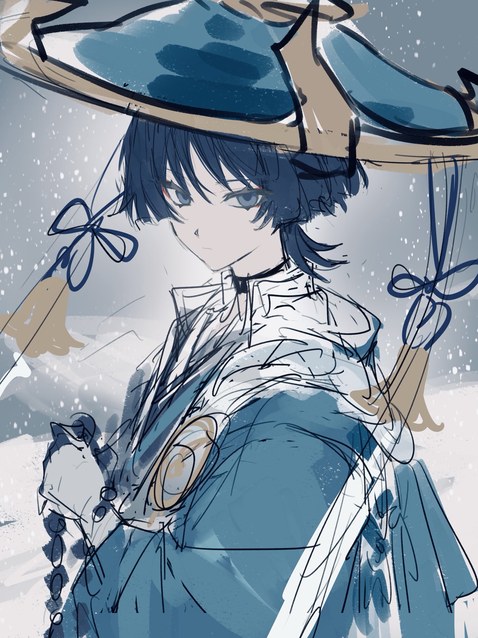 1boyalternate costumealternate universeblue eyesblue hairblurryblurry backgroundclosed mouthexpressionlesseyelinergloveshair between eyeshatjapanese clotheslooking at viewerlooking to the sidemakeupoutdoorsred eyelinershort hairsketchskysnowsnowingsolostandingupper body
