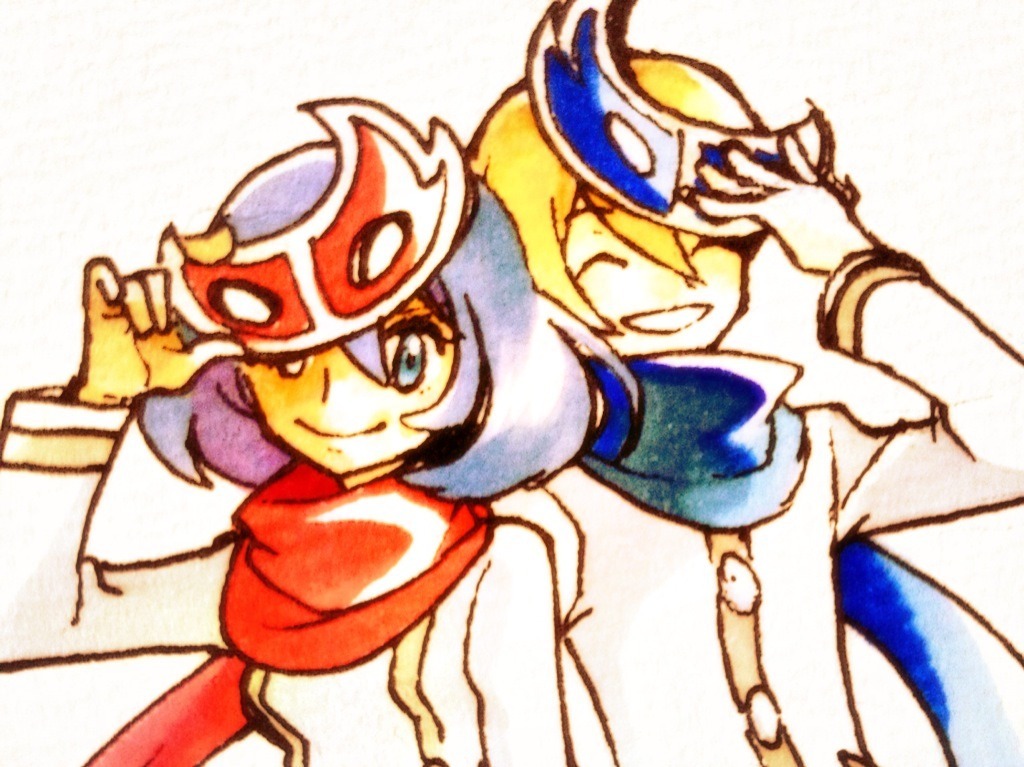 1boy1girlblonde hairblue scarfclosed eyeslooking at viewermask pullpurple hairred scarfscarfsmileupper body