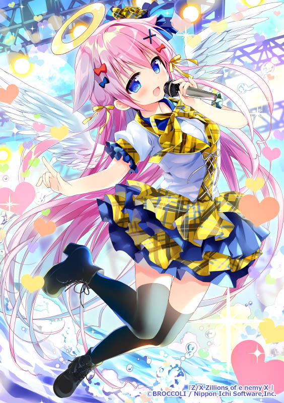 1girlangelblack shoesblack thighhighsblue bowblue eyesbowconcertcopyright noticedressfeathered wingsfrilled dressfrillshair bowhair ornamenthair ribbonhaircliphaloheartidol clotheslong hairmarie (z/x)open mouthpink hairred bowribbonshoessolosparklethighhighstraditional halovery long hairwater dropwhite wingswingsyellow ribbon