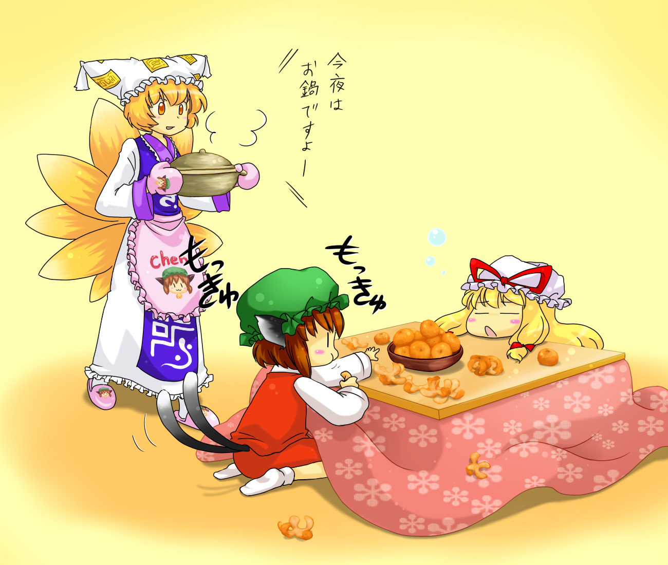 mito (go!go!king!), comiket 106, original, commentary request, highres, 1girl, :d, apron, bare shoulders, black hair, black scrunchie, black shorts, blush, breasts, cleavage, collared shirt, cover, cover page, dress shirt, grey hair, hair between eyes, hair ornament, hair scrunchie, holding, long hair, looking at viewer, medium breasts, mole, mole under eye, multicolored hair, open mouth, pink apron, ponytail, red eyes, red hair, romaji text, scrunchie, shinigami, shirt, short shorts, shorts, sleeveless, sleeveless shirt, smile, solo, two-tone hair, very long hair, white background, white shirt