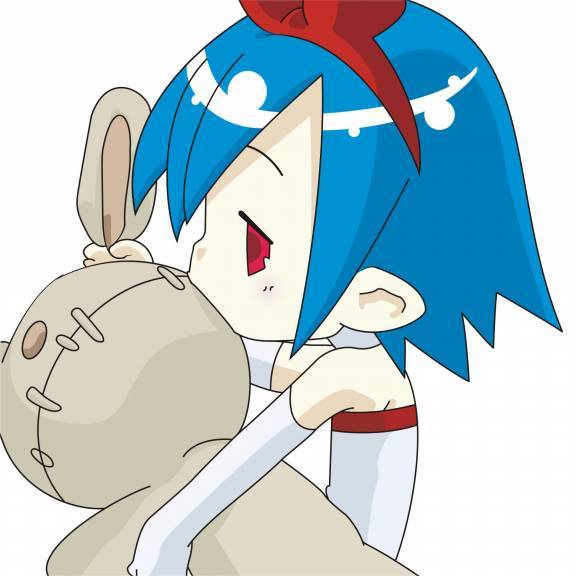 1girlblue hairdetached sleevesdressfemale focusflat chestpointy earsrabbitred eyesribbonshort hairsolostuffed animalstuffed rabbitstuffed toy