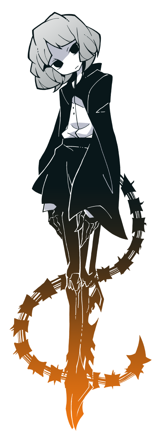 1girlblack coatblack eyesblack skirtcoatcoat on shouldersempty eyesfull bodygrey hairhead tilthigh contrastmechanical tailmedium hairshirtskirtsolotailtri fold talewhite shirt