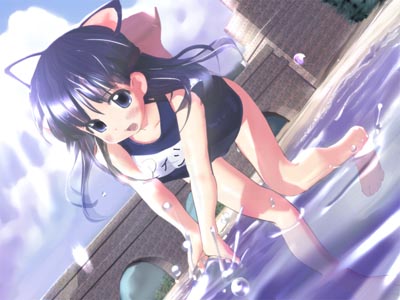 mint blancmanche, galaxy angel, 00s, 1girl, animal ears, blue hair, dutch angle, female focus, green eyes, looking at viewer, school swimsuit, short hair, solo, swimsuit, yellow eyes