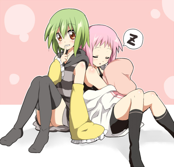 blushdetached sleevesfinger to mouthgreen hairpink hairshort hairshushingsleepingsockssshthighhighs