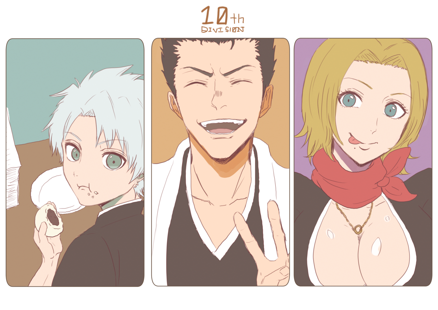 1girl2boysaged downblack hairblonde hairblue eyesbreastsclosed eyeseatingfoodgrey eyesgrey hairholdingholding foodjewelrylarge breastsmedium hairmolemole under mouthmultiple boysneckerchiefnecklaceopen mouthred neckerchiefsmiletonguetongue outv
