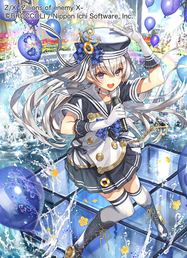 1girlballoonblack skirtbootsbowconcertcopyright noticeglovesgrey hairhathat bowhat ornamentholdingholding microphonelong hairmicrophonenu (z/x)open mouthpurple eyesrainbowsailor collarshort sleevesskirtsolosplashingteeththighhighsupper teeth onlywhite gloveswhite sailor collarwhite thighhighs