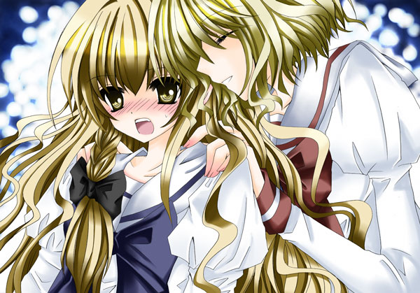 hirasaka makoto, kurata sayuri, kanon, blue one-piece swimsuit, hair ribbon, long hair, one-piece swimsuit, open mouth, ribbon, school swimsuit, smile, solo, swimsuit