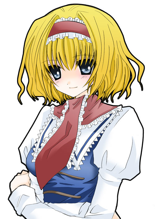 1girlblonde hairblue eyescrossed armsfemale focushairbandshort hairsimple backgroundsoloupper bodywhite background