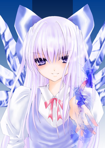 1girlalternate hair lengthalternate hairstyleblue eyesbowfemale focushair bowlong hairsmilesolowings