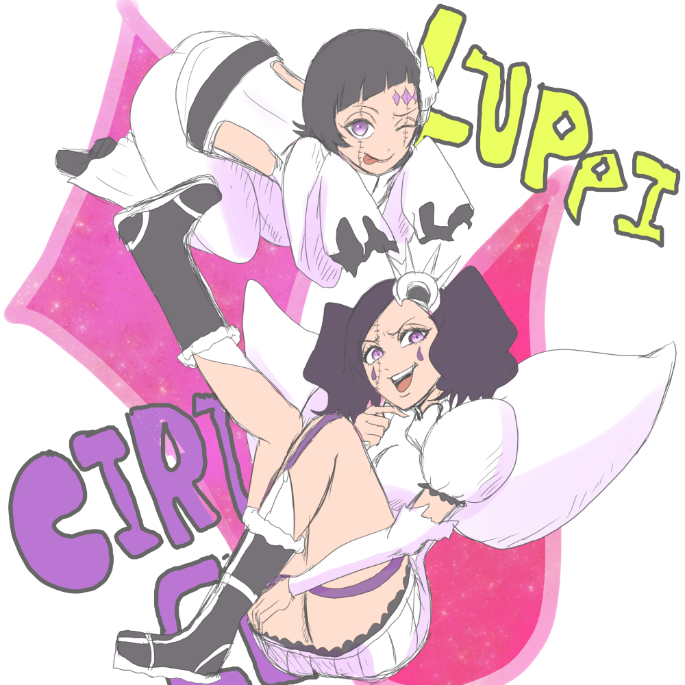 1boy1girlandrogynousarrancarelbow glovesenglish textfacial markgarter strapsgloveshair ornamentleg uplooking at viewerone eye closedopen mouthpuffy sleevespurple eyespurple hairshort hairstapled faceteethtrapupper teeth onlywink