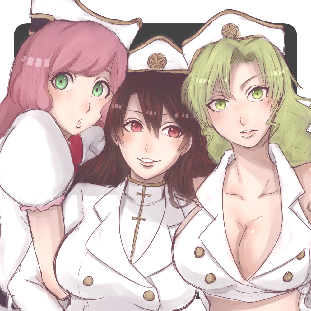 3girlsbare shouldersblack hairbreastscleavagecollarbonegreen eyesgreen hairhatlarge breastslipslong hairlooking at viewermilitary hatmultiple girlsparted lipspink hairpuffy sleevesquincy (bleach)shiny skinsternritterteethwandenreich uniform