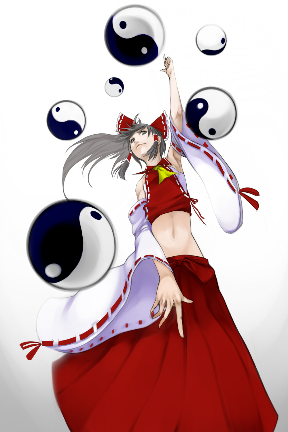 1girlarmpitsblack hairdetached sleevesfemale focusgradient backgroundjapanese clotheslong hairmidriffmikonavelskirtsolowhite backgroundyin yang