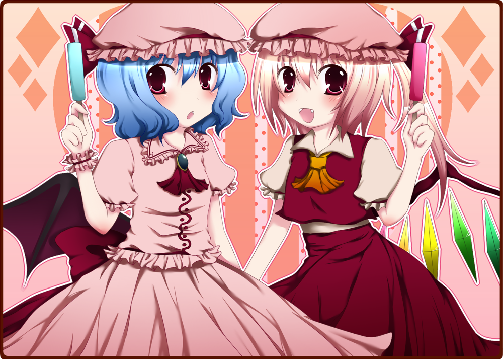 2girlsbat wingsblonde hairblue hairfemale focusfoodhatmultiple girlsone side uppopsiclered eyesshort hairsiblingsside ponytailsisterswings