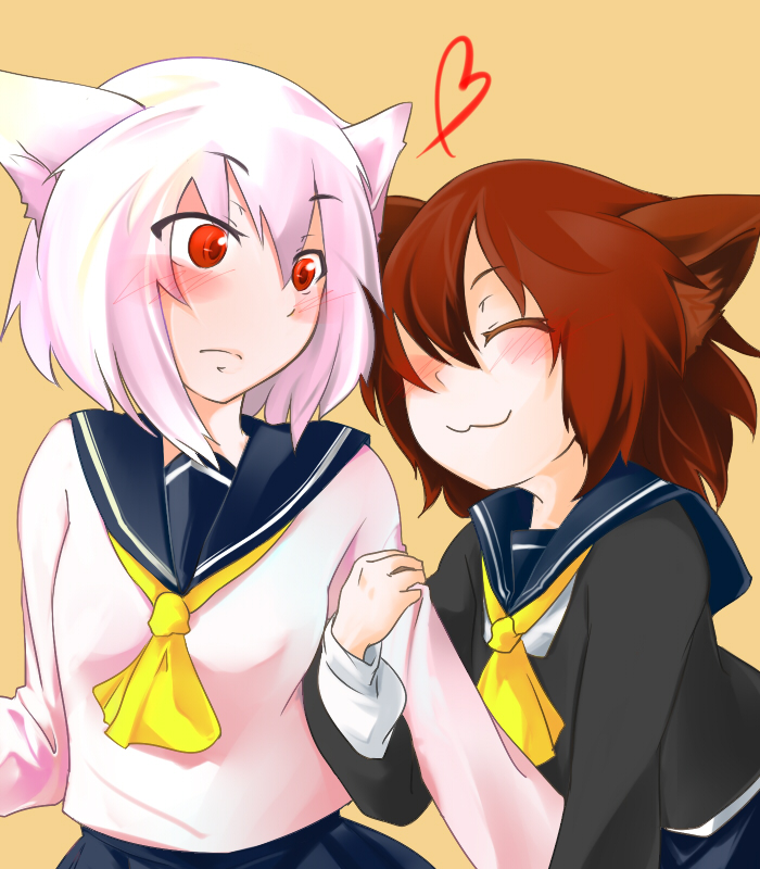 :32girlsalternate costumearm hugblushbrown haircontemporaryfemale focushappyheartmultiple girlsno headwearone-eyedpink hairred eyesschool uniformshort hairsmile