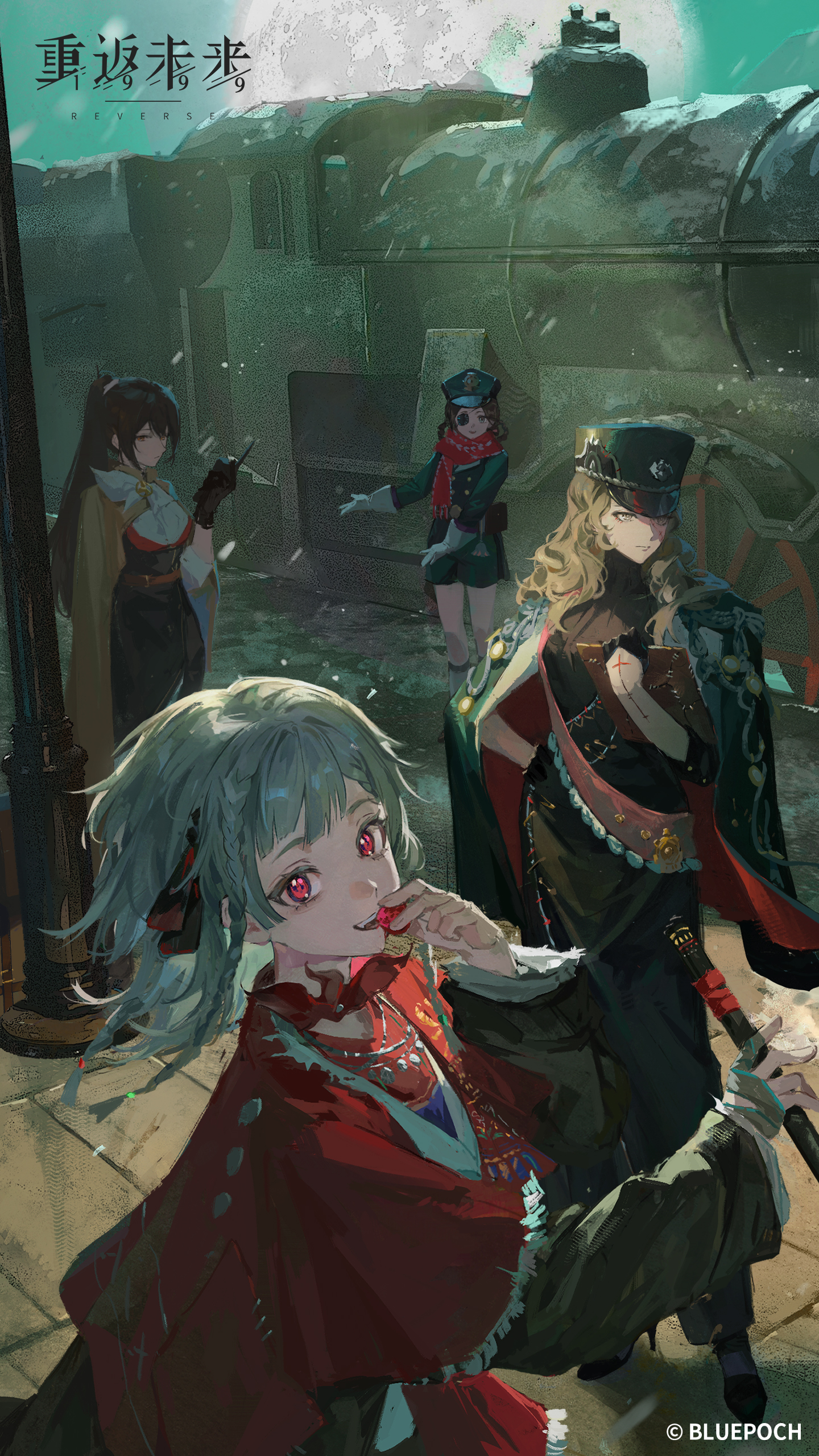 :d4girlsaima (reverse:1999)black coatblack dressblack glovesblack skirtbootsbraidbraided hair ringsbrown capebrown eyesbrown haircapecloakcoatcoat on shoulderscopyright namecopyright noticecorvus (reverse:1999)dresseyepatchflutefoodfruitfull moonglovesgreen jacketgreen shortsgreen skygrey hairhair ringshatholdingholding fluteholding foodholding fruitholding instrumentholding walkie-talkiehuge mooninstrumentjacketlamppostlocomotivelogolong hairlooking at viewerlooking to the sidemedium hairmoonmultiple girlsnightnight skyopen mouthoutdoorspeaked capponytailquad braidsred cloakred eyesred sashred scarfsashscarfshirtshortsshoulder sashskirtskysmilesnowingspotlightstandingsteam locomotivestitched armstitched facestitchestraintrain station platformwalkie-talkiewhite bootswhite gloveswhite shirt