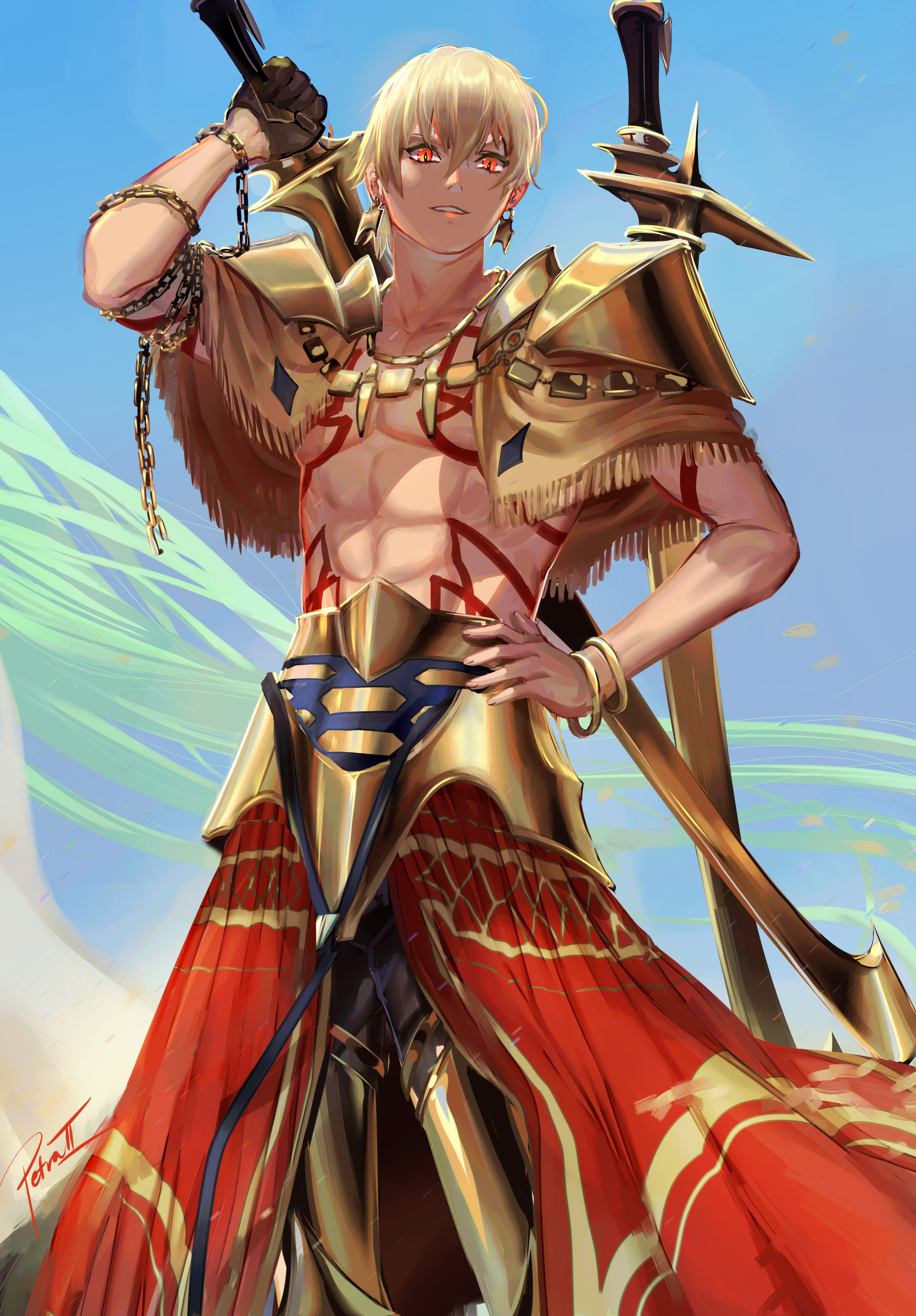 1boyarmorblonde hairblue skyearringsenki (fate/prototype)goldgold armorholdingholding behind backholding swordholding sword behind backholding weaponholding weapon behind backjewelrymale focusnecklacered eyesskysmilesoloswordweapon