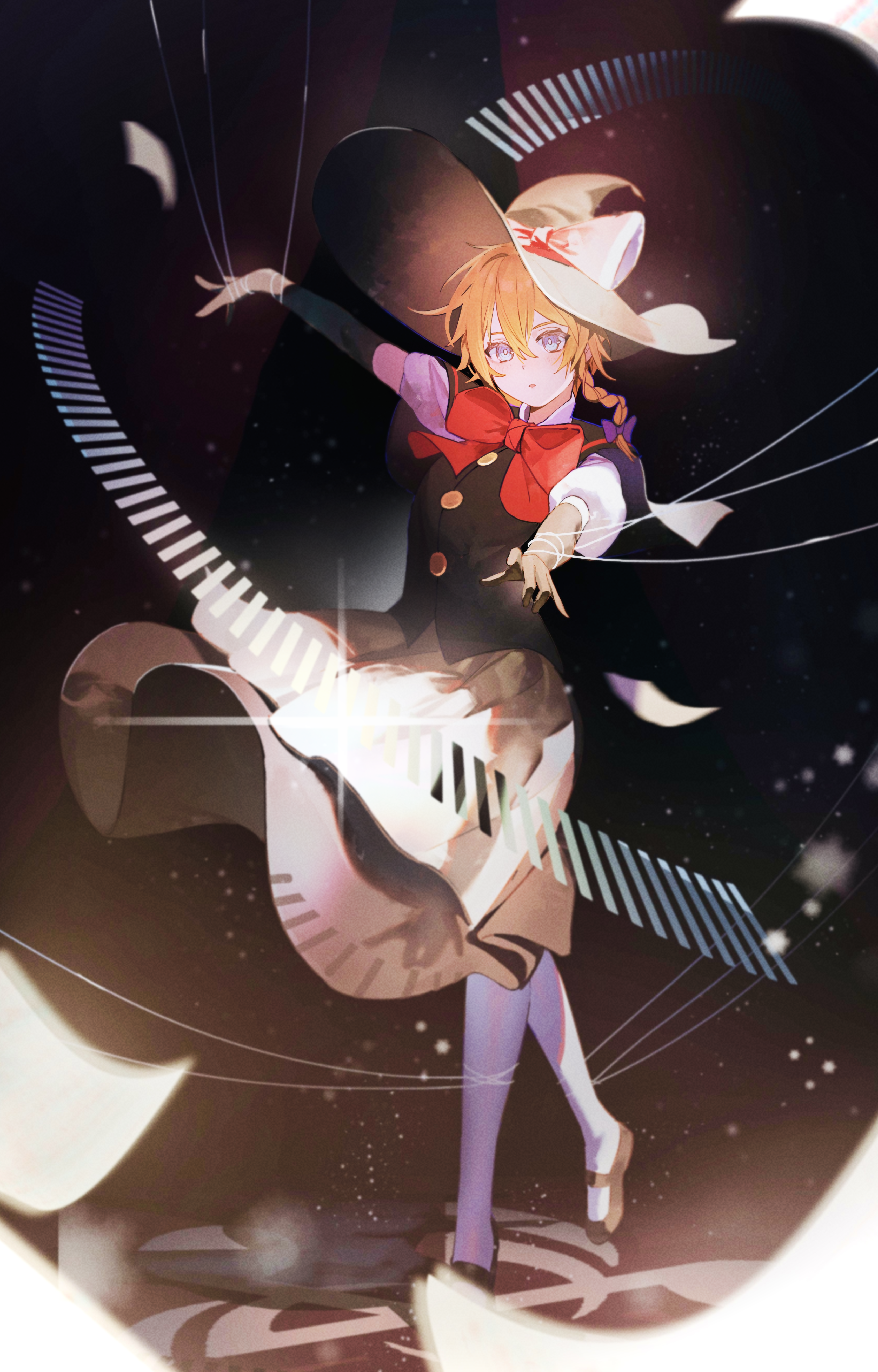 1girlblack capeletblack glovesblack hatblack shoesblack skirtblack vestblonde hairblue eyesbowbowtiebraidbuttonscapeletelbow glovesfull bodygloveshair bowhathat bowmary janespantyhosepiano keyspuffy short sleevespuffy sleevespuppet stringsred bowred bowtieshirtshoesshort hairshort sleevesside braidsingle braidskirtskirt setsolostandingvestwhite pantyhosewhite shirtwitch hat