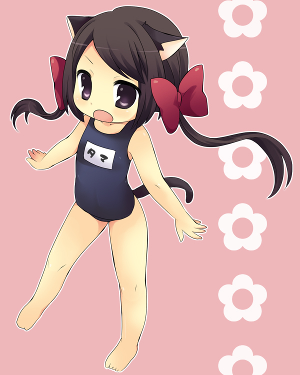 :oanimal earsbarefootbrown hairchildhair ribbonlong hairone-piece swimsuitpurple eyesribbonschool swimsuitsimple backgroundsoloswimsuittailtwintails