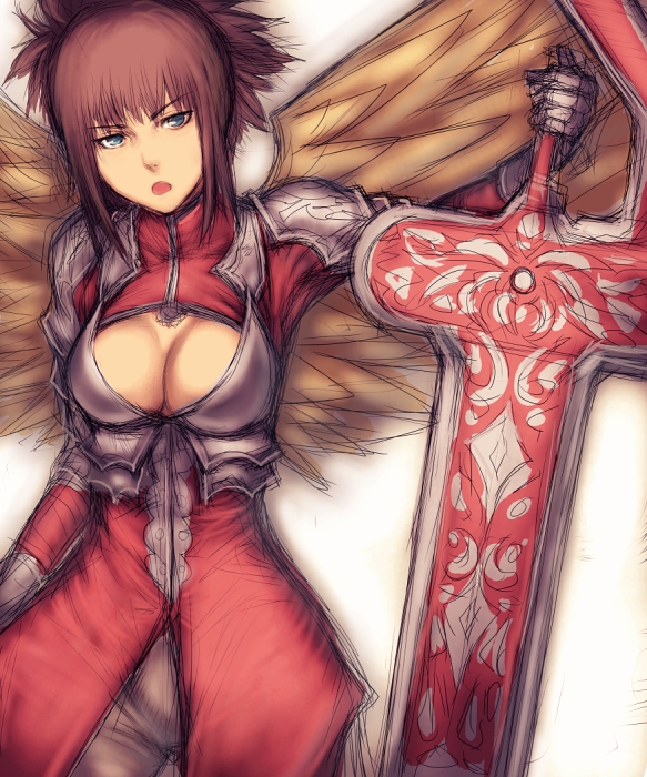 :o1girlarmorblue eyesblunt bangsbreastsbrown haircleavagecleavage cutoutclothing cutoutfemale focusglovesgradient backgroundhuge weaponno braopen mouthpantyhoseshort hairsketchsolostandingswordturtleneckweaponwings
