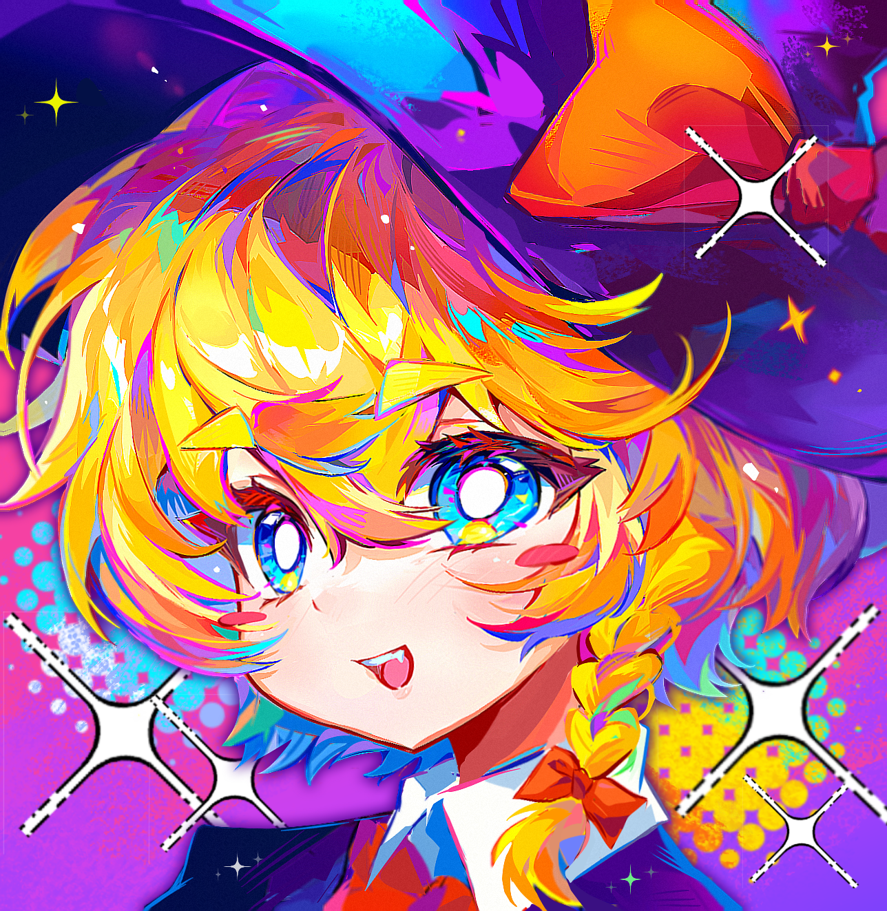 1girlblonde hairblue eyesblushblush stickersbowbraidbright pupilscolorfulhair bowhathat bowlooking at vieweropen mouthportraitpurple hatred bowshort hairside braidsingle braidsmilesolosparklewhite pupilswitch hat