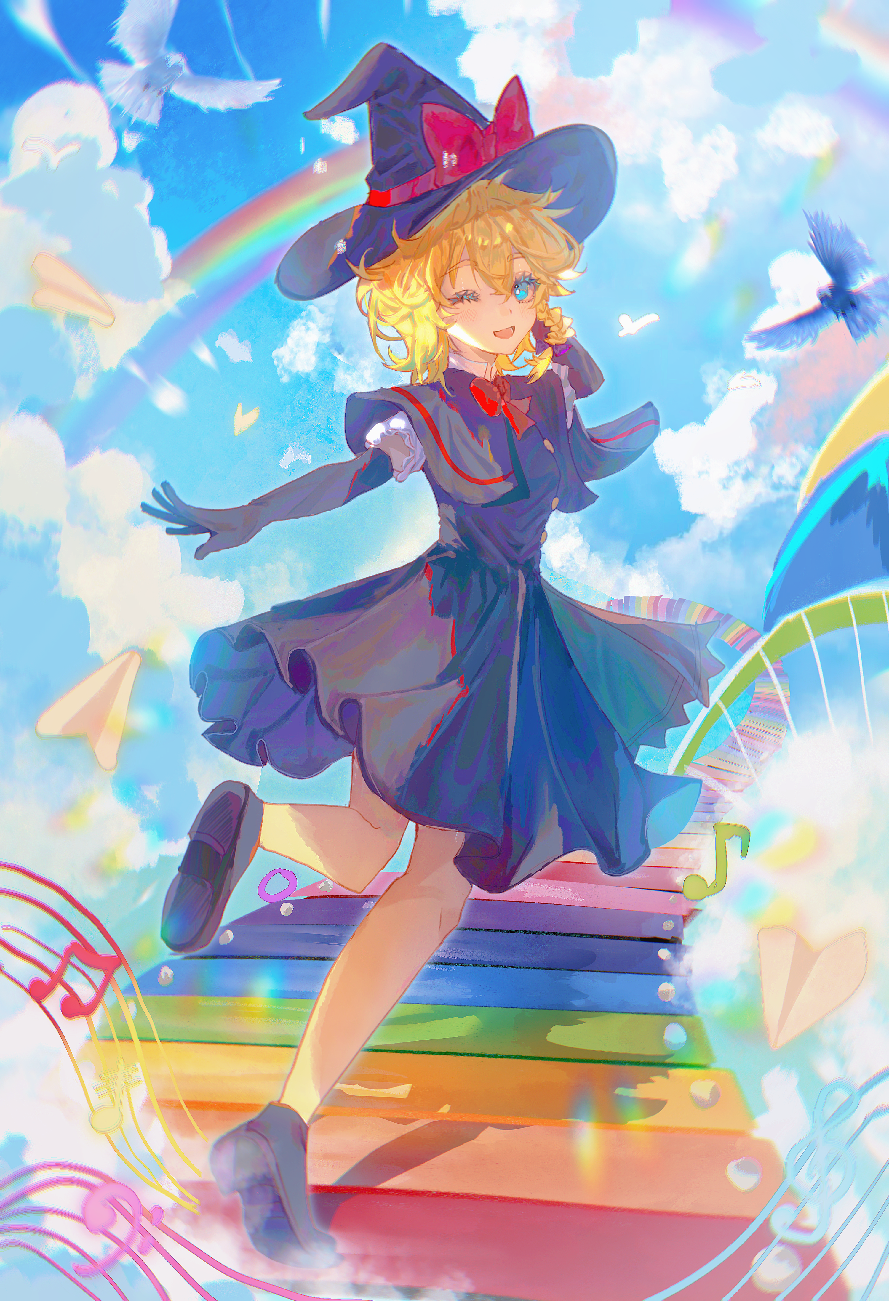 1girlabove cloudsapronbirdblack capeletblack glovesblack hatblack shoesblack skirtblack vestblonde hairblue eyesblue skybowbowtiebraidbrown apronbuttonscapeletcloudelbow glovesfull bodygloveshair bowhathat bowinstrumentlooking at viewerlooking backmusical staffone eye closedopen mouthpantyhosepaper airplanepuffy short sleevespuffy sleevesrainbowred bowred bowtieshirtshoesshort hairshort sleevesside braidsingle braidskirtskirt setskysmilesolovestwaist apronwalkingwhite pantyhosewhite shirtwitch hatxylophone