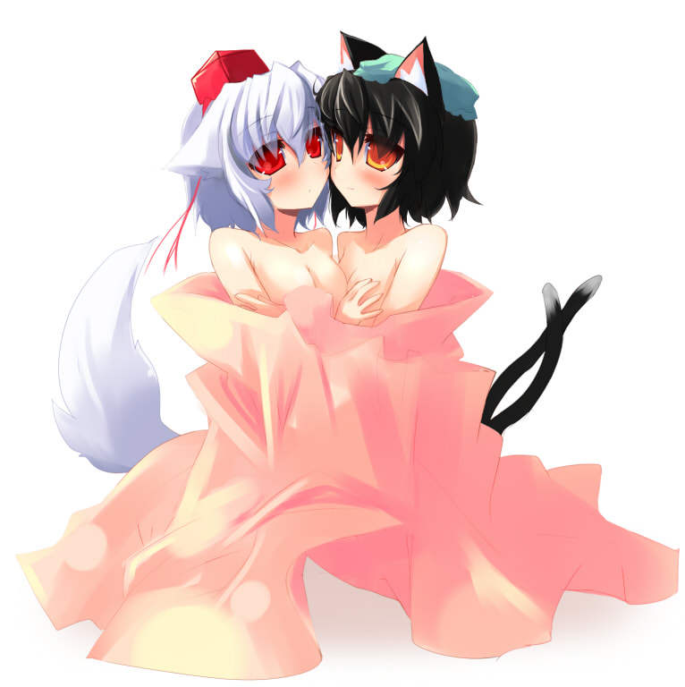 2girlsanimal earsblack hairblushbreastscat earscat girlcat tailfemale focushatmultiple girlsmultiple tailsred eyesshort hairsmall breaststailtokin hattowelwhite hairwolf earswolf tailyuri