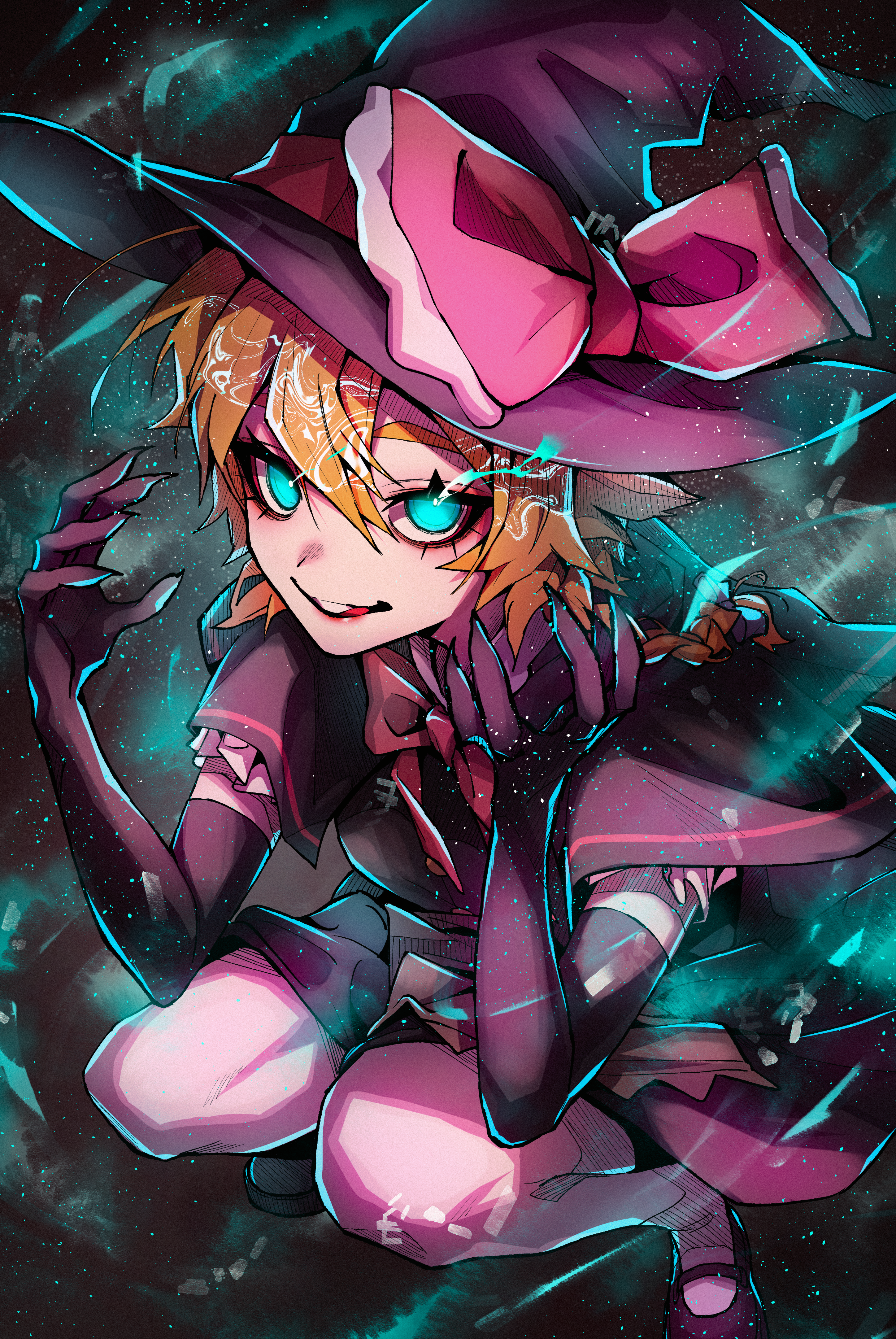 1girlapronaurablack backgroundblonde hairblue eyesbowbowtiebraidbrown aproncapeletelbow gloveseye trailfull bodygloveshair between eyeshands uphathat bowlight traillooking at viewermary janesopen mouthpantyhosepurple capeletpurple glovespurple shoespurple skirtpurple vestred bowred bowtieshoesshort hairside braidsingle braidskirtsmilesolosquattingvestwaist apronwhite pantyhosewitch hat