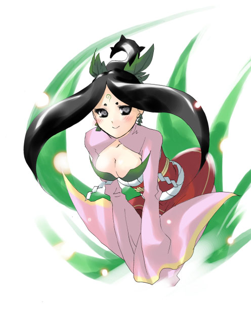 periq5xg, kurotsuchi nemu, bleach, flower request, traditional media, 1girl, black hair, braid, braided ponytail, breasts, flower, hell butterfly, japanese clothes, long hair, shihakusho, simple background, upper body, yellow background